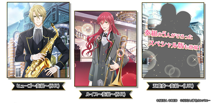 「夢キャス」タッチで描き下ろされたイラスト&録り下ろしボイスの豪華カードに、専用のキャストドラマもついています。「奏組」メンバー5人が揃った「五重奏〜奏組〜(UR)」では豪華声優5名のボイスが!?